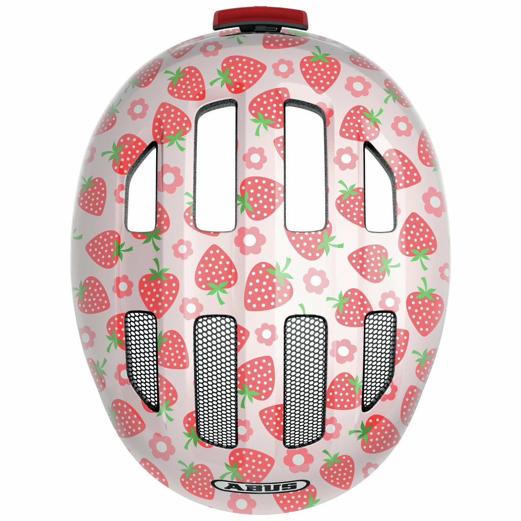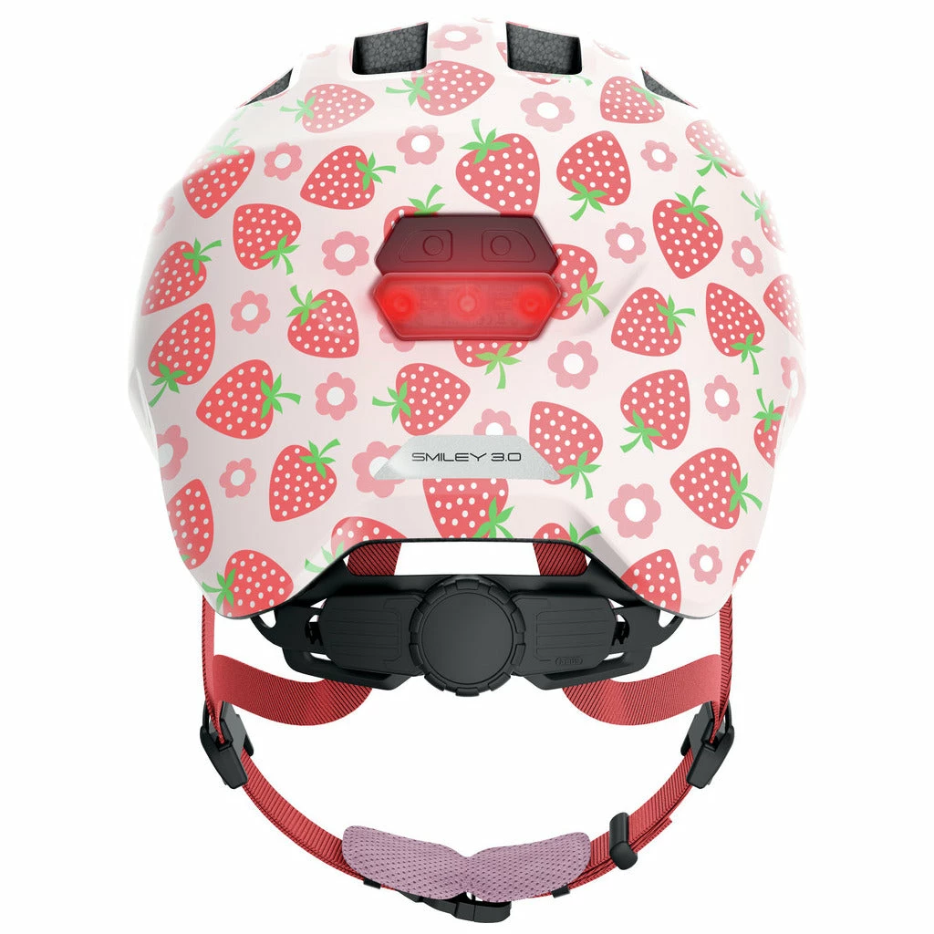 - Le casque Abus Smiley 3.0 LED Rose Strawberry Shiny : casque vélo rose avec motifs de fraises